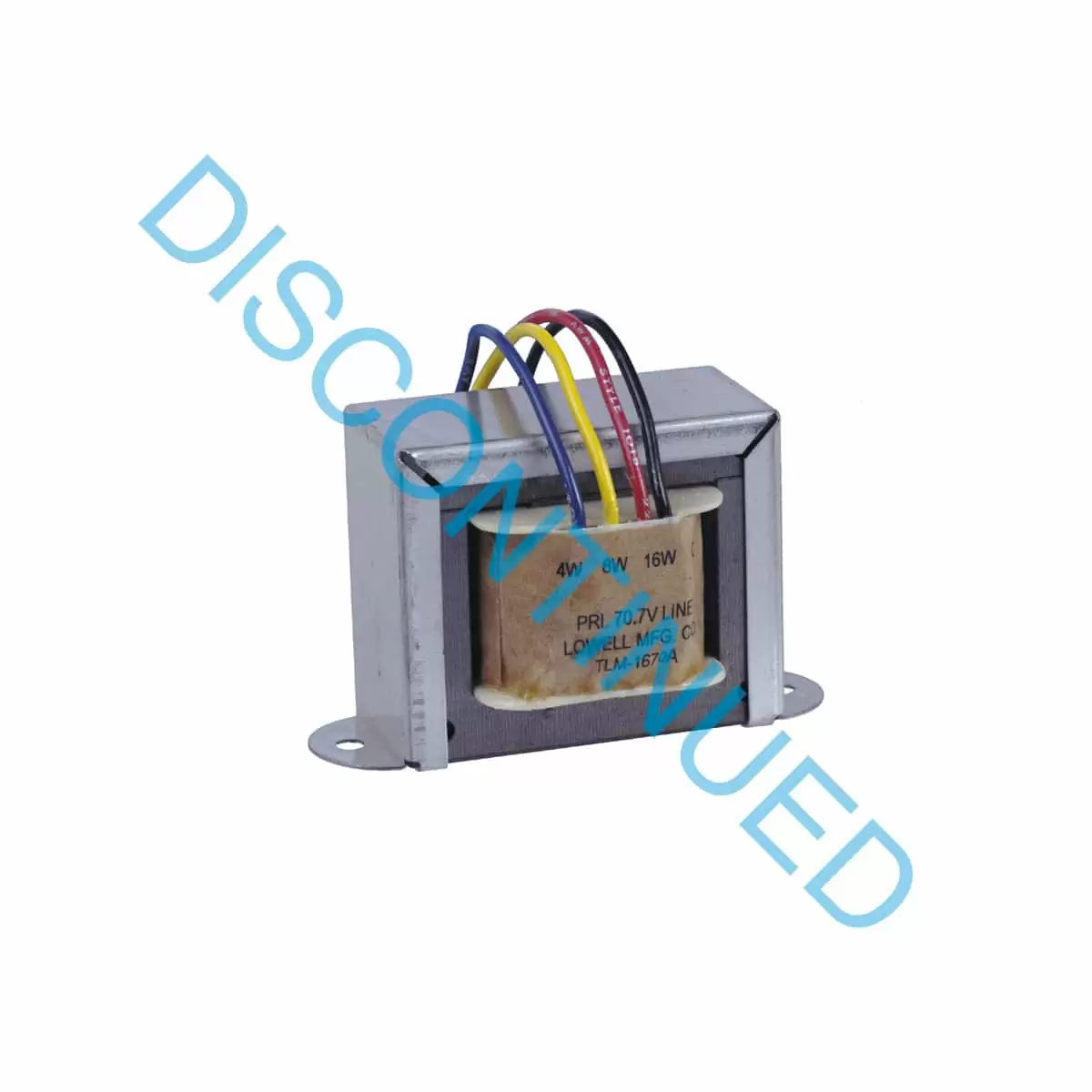 The line matching 16W transformer shall be Lowell Model TLM-1670A. Primary voltage shall be 70V with a power rating of 16 watts. Primary taps shall be available at 16/8/4 watts. Secondary impedance taps shall be available at 8 ohms and 4 ohms. All taps shall have clearly marked color-coded leads. Frequency response of the transformer shall be 50Hz–15kHz (±1dB) with insertion loss not to exceed 0.6 dB.