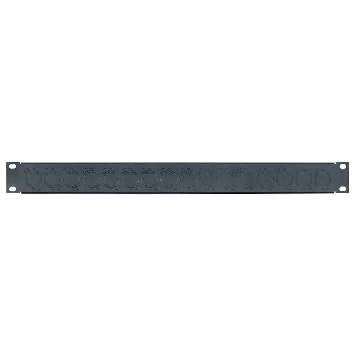 The universal connector rackmount panel shall be Lowell model UCP-1-16, which shall be 18-gauge certified U.S. steel with a smooth black powder epoxy finish. It shall feature 16 laser-cut combination knockouts sized to accept a variety of connectors, and a rear flange/tray to assist with cable management. Panel dimensions shall be 19-in. wide x 1.75-in. high (1U) x 3-in. deep. The panel shall be made in the U.S.A.