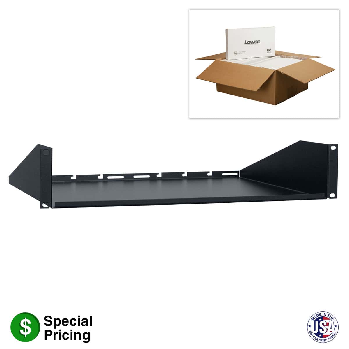 The 19-inch rack utility shelf features a solid base and flanges in front and rear for added strength. The rear flange has notches to mount an optional 12-inch power strip for convenient access to power. Steel with smooth-black powder-coat finish. Shelf is available in two depths (10.75 in.).