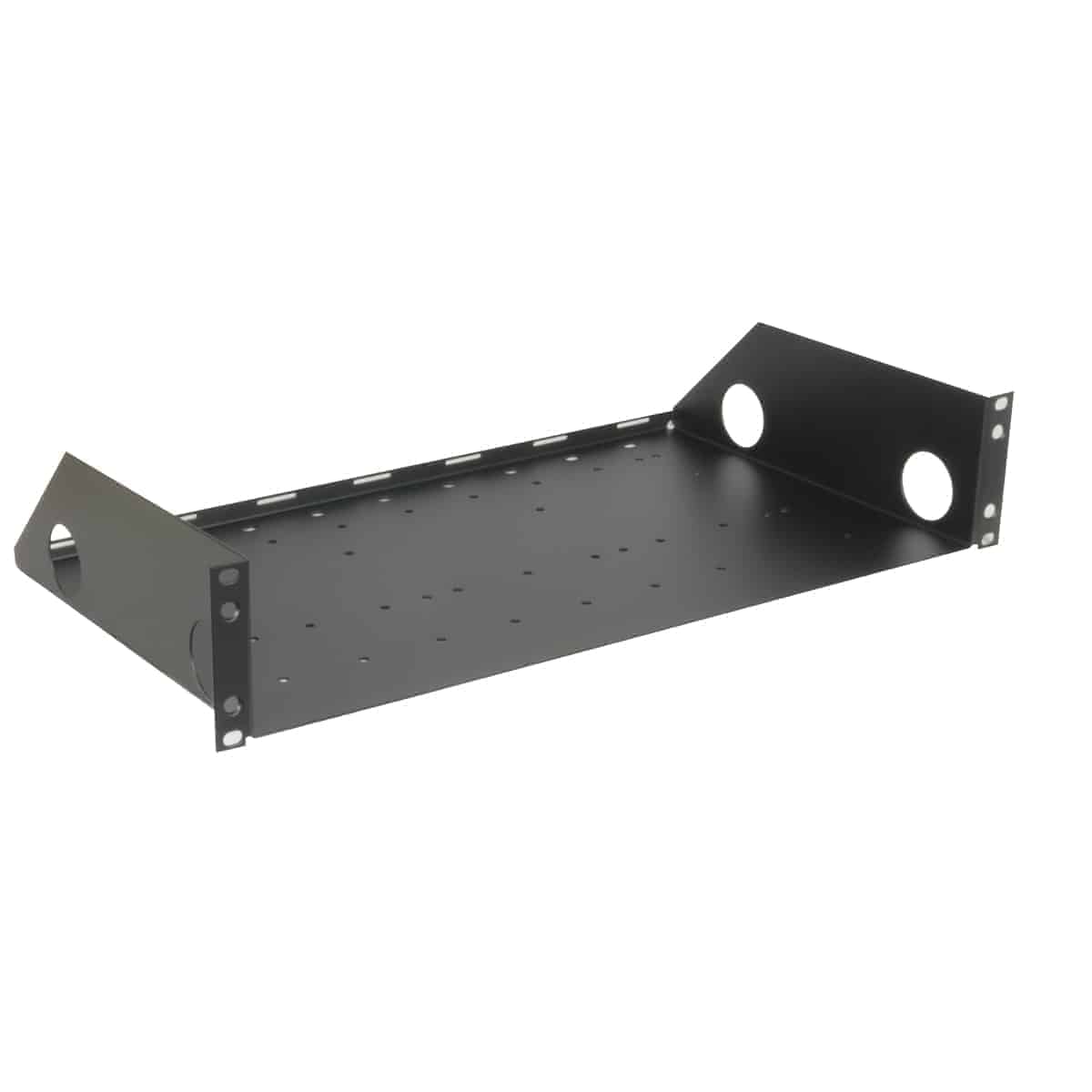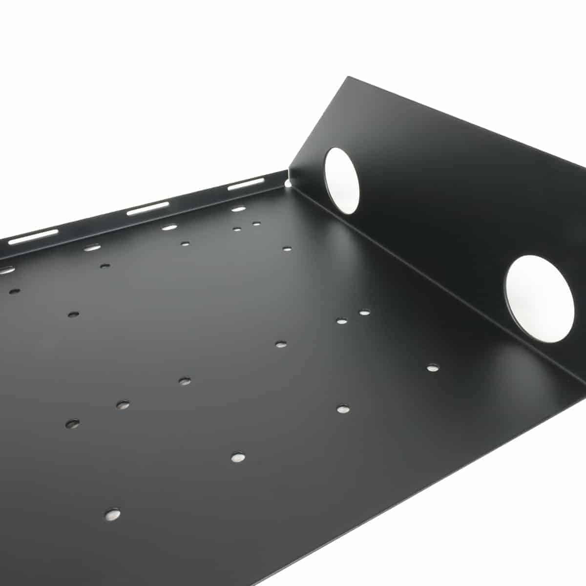 This rack utility shelf features a rear flange for strength and a base that's punched to hold screw-mount chassis-style electronics. The shelf features cable lacing points and a front security panel. Steel with smooth black powder epoxy finish.