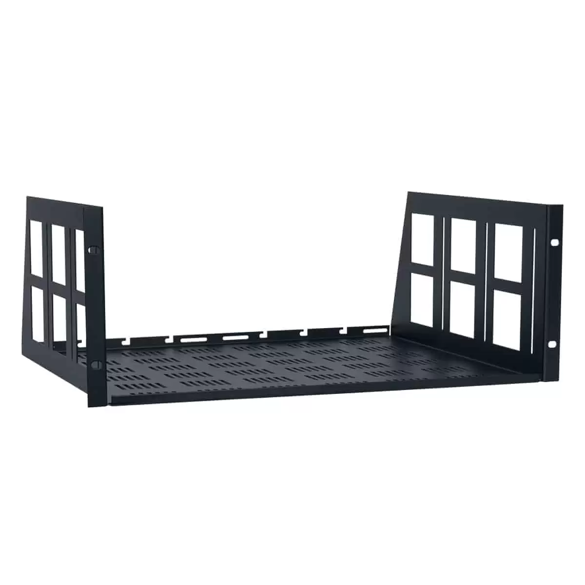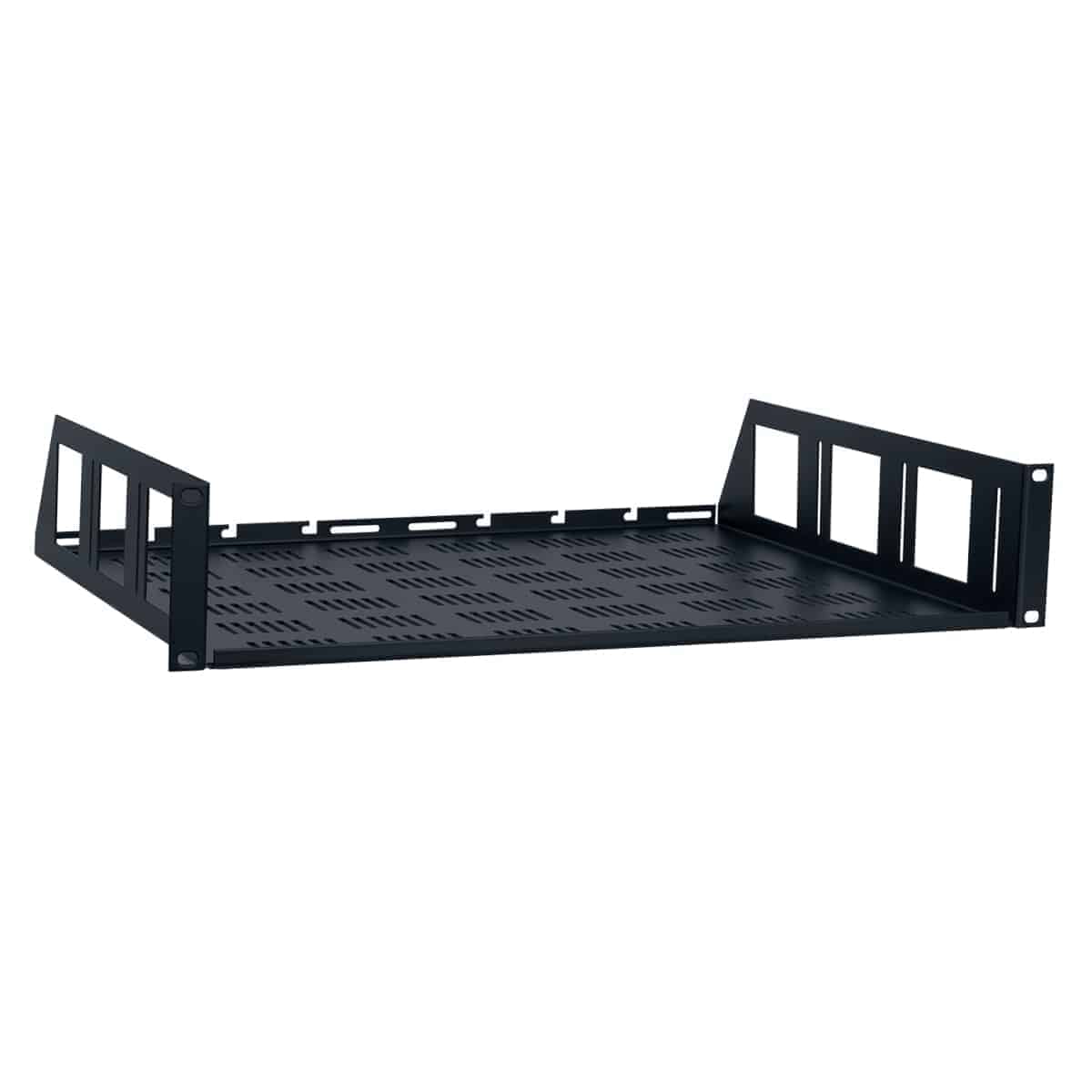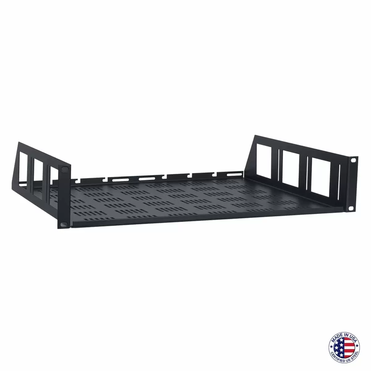 The rackmount vented utility shelf shall be Lowell Model No. USV-_____, which shall measure 19”W x ______”D x ____U. The shelf shall be 16-gauge certified U.S. steel construction with a smooth black powder epoxy finish. It shall feature a fully vented base to promote passive ventilation, a 0.375” front flange, and a 0.562” slotted back flange. The shelf shall have a load capacity of 50 lbs. and shall be made in the U.S.A.