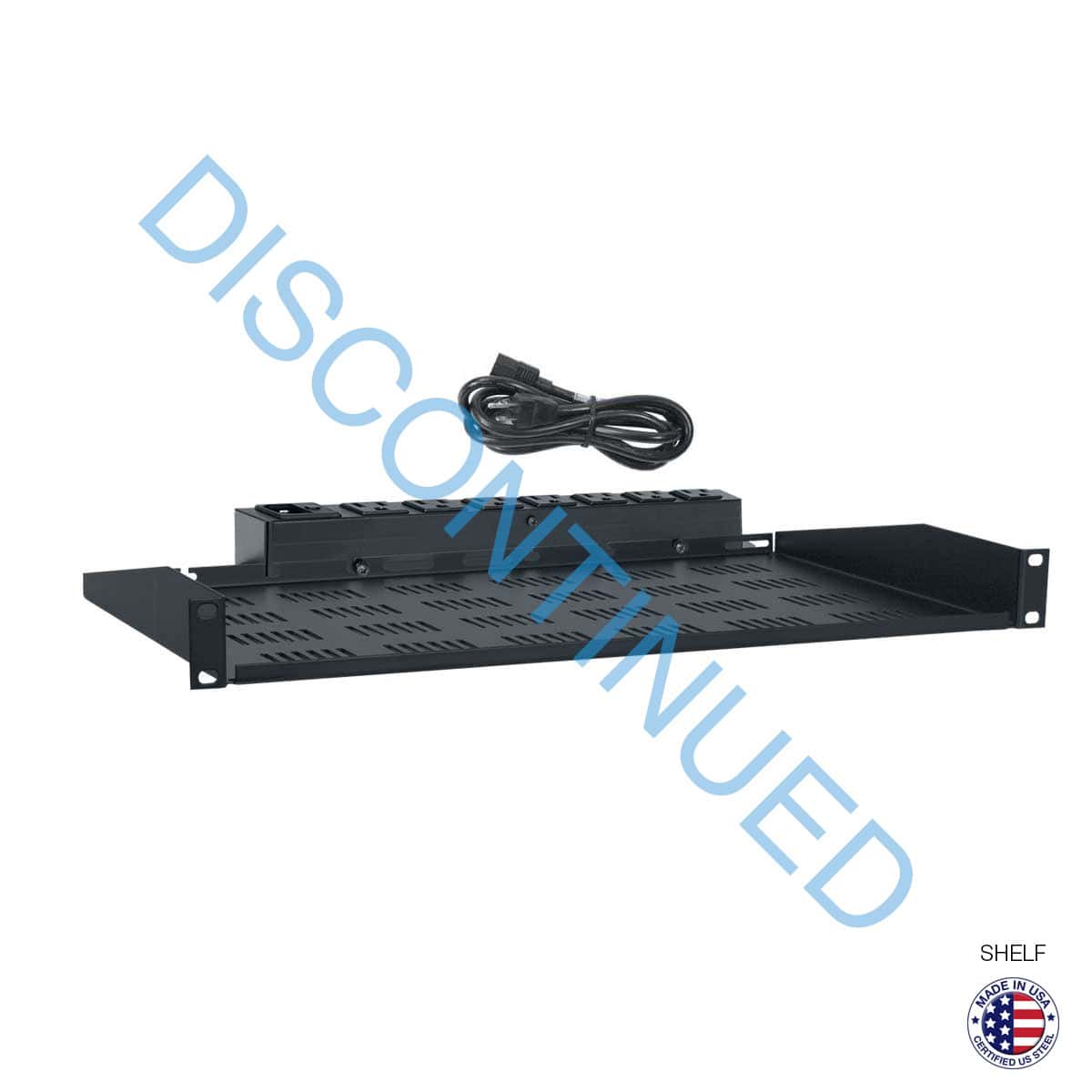 The rackmount shelf/power strip bundle shall be Lowell model USVAC-110, which shall include a 1RU x 10.75″D x 19″W certified U.S. steel shelf with fully vented base, smooth black powder epoxy finish, front/rear flanges, tie-off points for cables, and notches to mount the included power strip. The shelf shall have a load capacity of 50 lbs. The (12″L) ETL Listed power strip shall feature seven (7) 15A NEMA receptacles, circuit breaker, and detachable 6 ft. IEC cord with molded plug. It shall have a power rating of 120VAC 15A 60Hz. The shelf and power strip shall be made in the U.S.A.