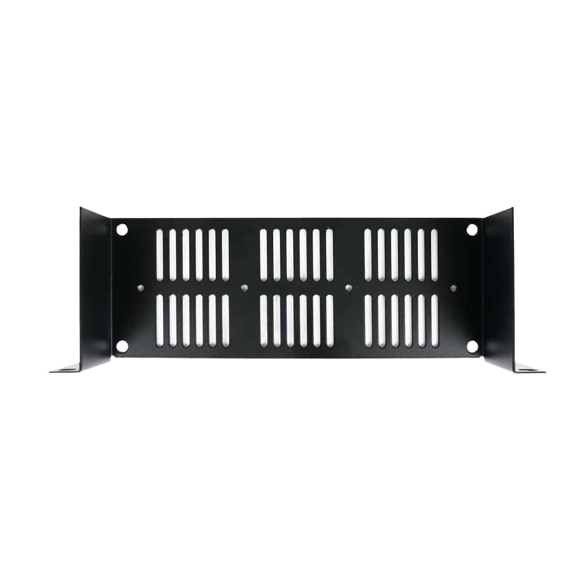 These 10.4-inch wide steel utility shelves with vents base are made for use with Lowell LHFR Series half-width racks. Three depths available. Black finish.