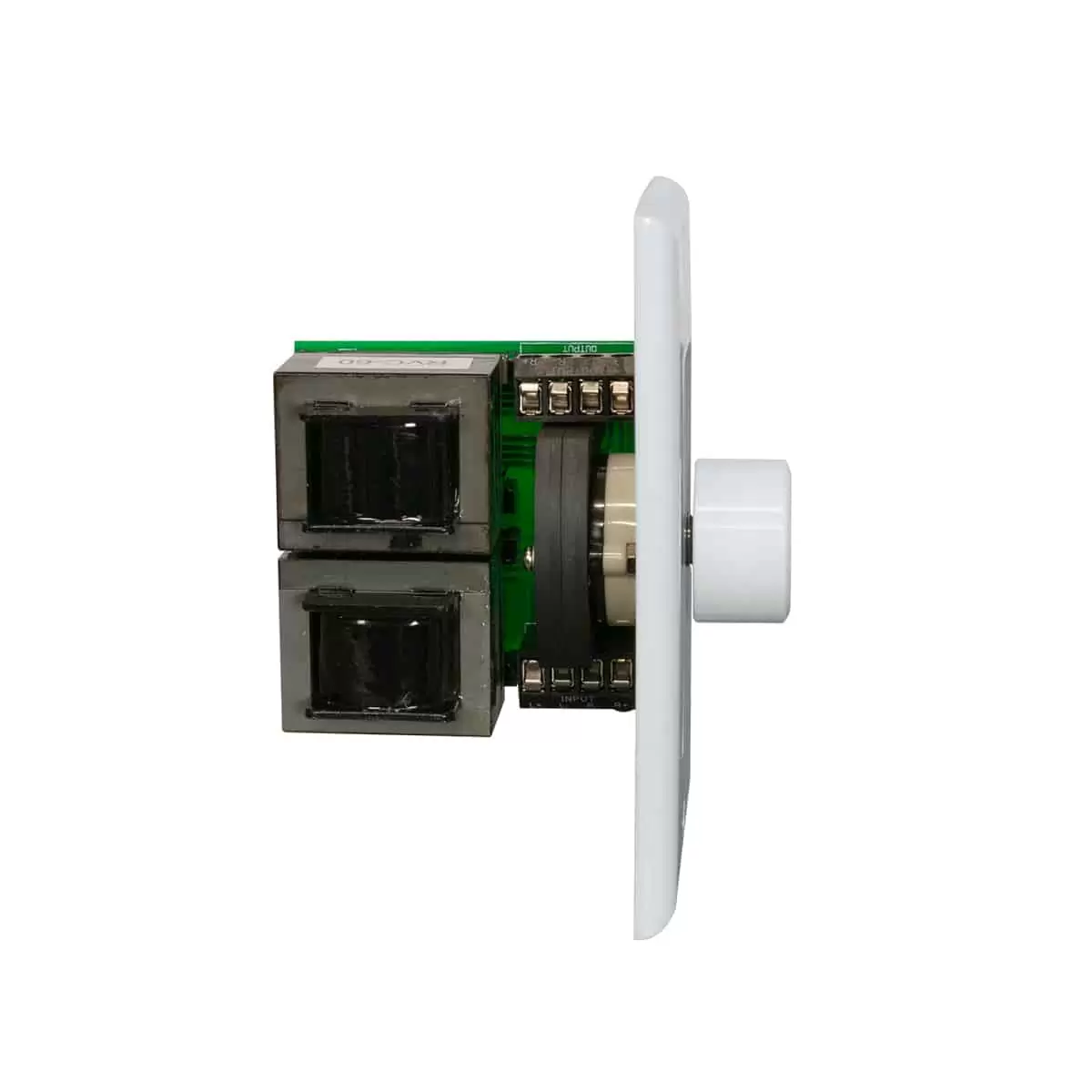 The stereo volume control for use with 8ohm speaker line shall be Lowell model VCS8-DW with 50W power rating, 3dB per step attenuation, and phoenix style plug-in screw termination strips for pre-wire convenience (wire capacity up to 14-gauge). It shall include a one-gang decorator style white wall plate. The device shall include a rotary switch with stops at “off” and “max”. The unit shall be able to mount in an E.O. box that has minimum inside dimensions of 1.875″W x 3″H x 2.5″D.