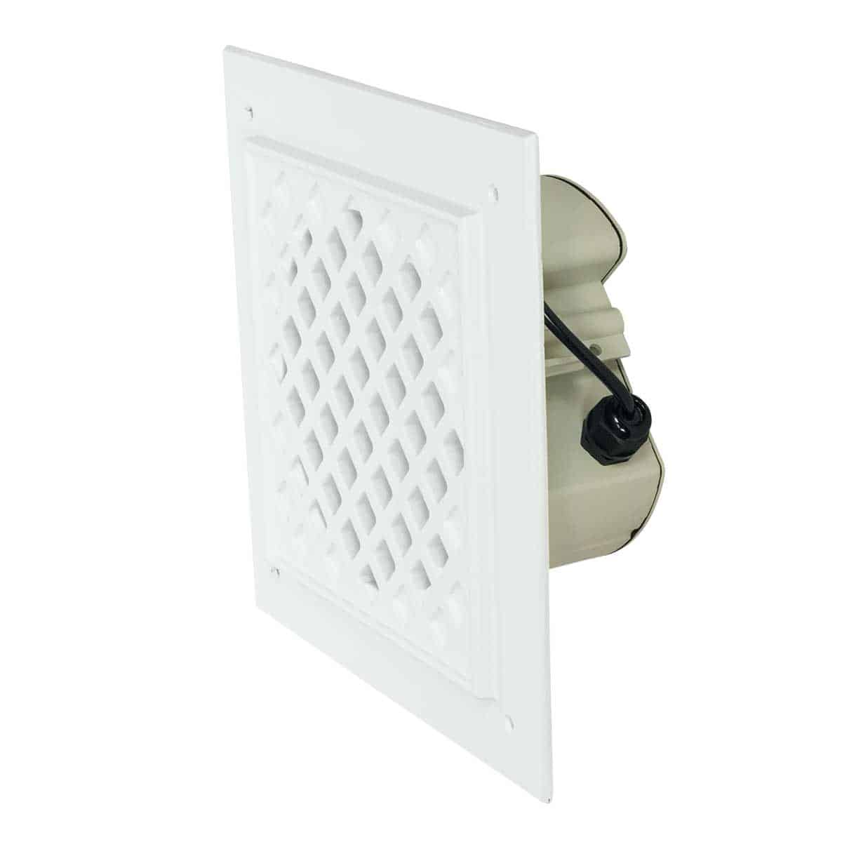 The speaker assembly shall be Lowell Model VRG-LUH15TX, which shall feature a vandal-resistant cast aluminum grille with secondary galvanized steel perf. The cast aluminum grille with white finish shall be mounted to a weather resistant re-entrant horn (LUH-15TX). The re-entrant horn shall include a self-contained compression driver in cast aluminum weather-resistant housing that can be installed in 4 inch deep (minimum) space. Power rating shall be 15 watts continuous. Unit shall include a 100/70/25V transformer with taps selectable on rear of horn, and includes an 8ohm transformer bypass input. The VRG-LUH15TX will ship ready for standard two-wire connection with cable exiting through a rear waterproof gland-type connector.