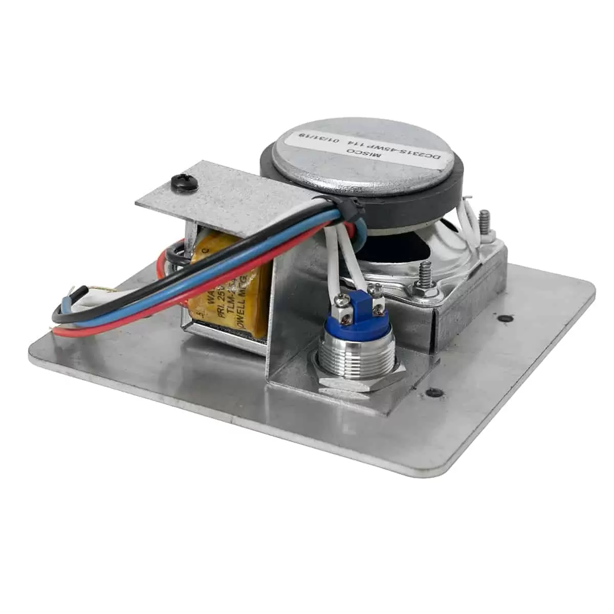 The vandal-resistant intercom station with call switch shall be Lowell model VRIC-2G-4525, which shall feature a 45ohm speaker with 25V transformer and a 2-gang wall plate, 11-gauge stainless steel with brushed finish. It shall include vandal-resistant screws and driver bit. The intercom station shall also feature a push button call switch, which shall be a SPST normally open momentary switch.