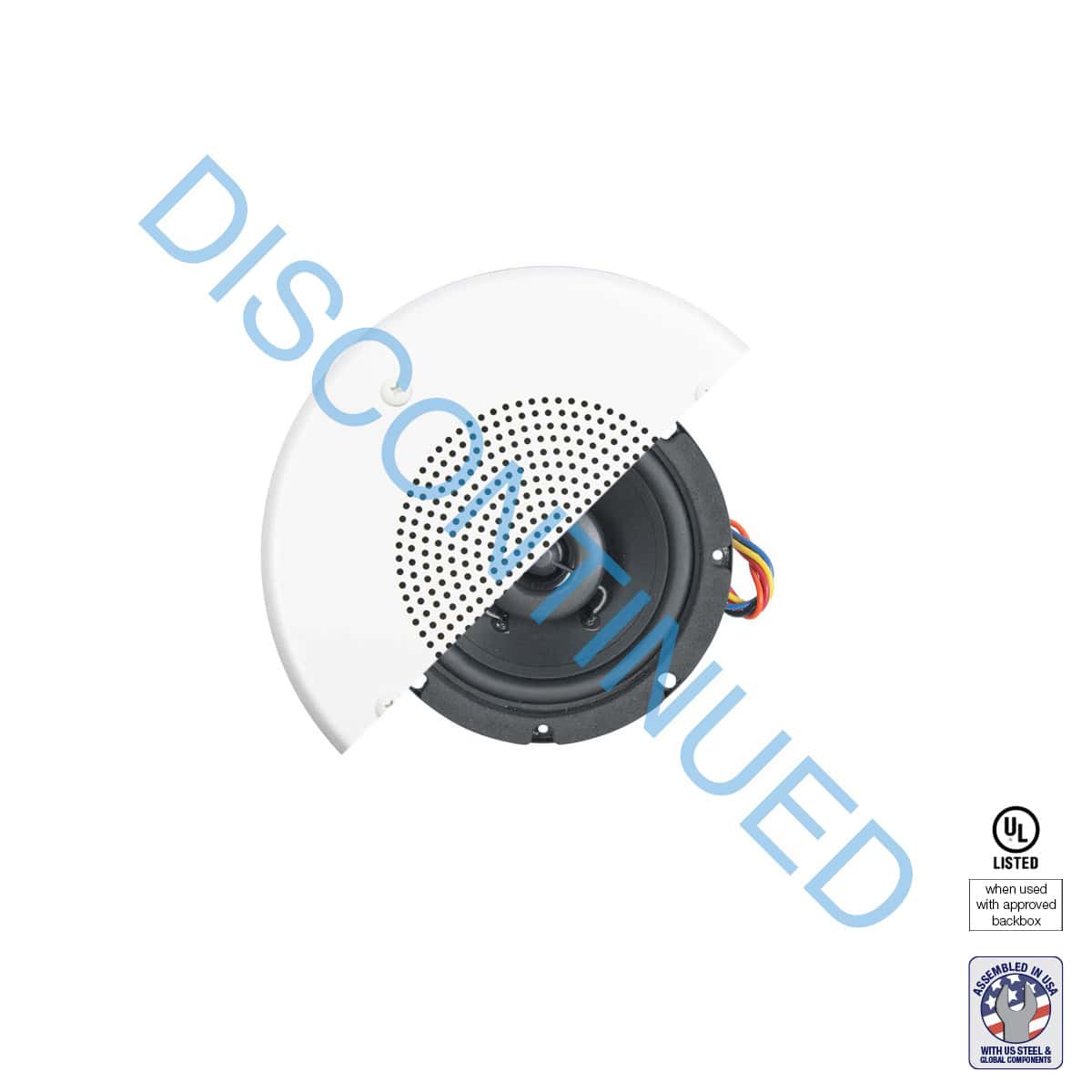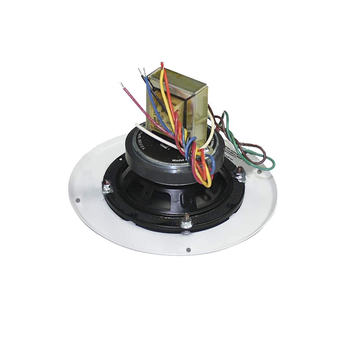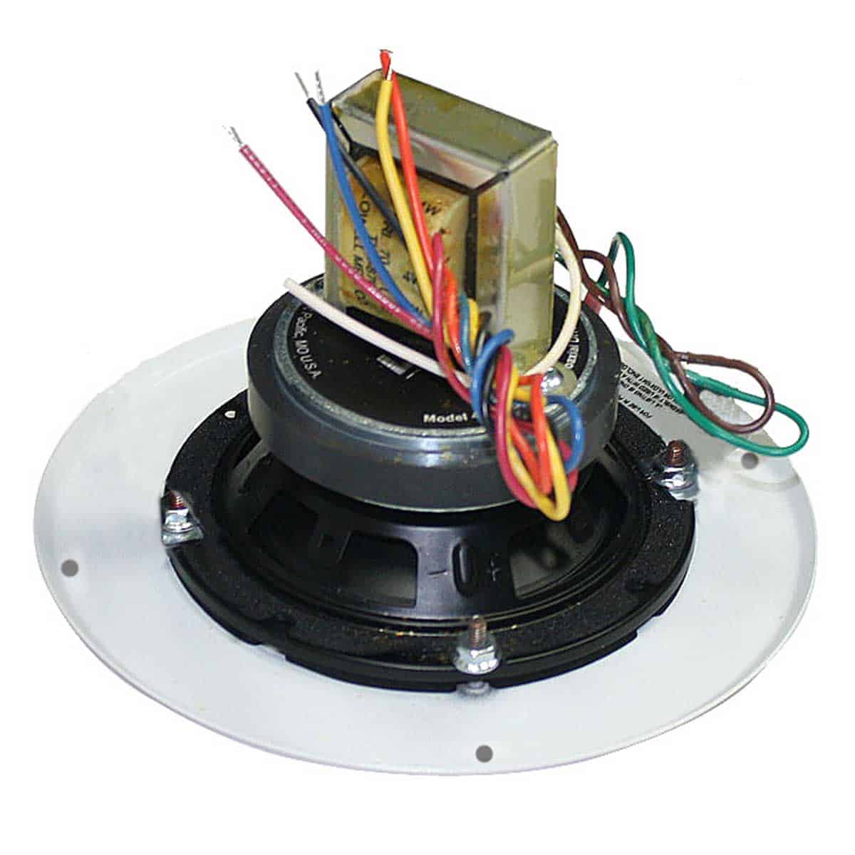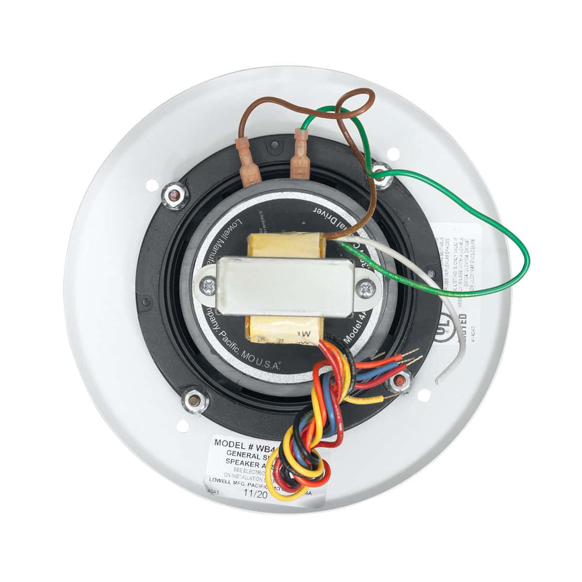 The speaker assembly shall be Lowell Model WB4-4A30-T870, which shall include a 4” driver, 70V transformer and grille. The driver shall be of the coaxial type with high and low frequency transducers. Low frequency section shall have a 4” dia. polypropylene cone; high frequency section shall have a tweeter with a 1″ dia. balanced-drive dome. Built-in electrical crossover network shall be employed to accomplish proper frequency division between the two drivers. Crossover frequency shall be at 5kHz with first order high-pass filter. It shall be capable of producing a uniform audible frequency response over the range of 70Hz-20kHz (+6dB) and 50Hz-20kHz (+8.8dB) with dispersion angle of 150 degrees @2000Hz (-6dB). Average sensitivity shall measure 88.0dB (SPL at 1W/1M). Rated power handling shall be 30W (EIA 426B). The 1″ dia. low frequency voice coil shall operate in a magnetic field derived from a ferrite (ceramic) magnet with nominal weight of 10oz.; the 0.53″ dia. high frequency voice coil shall operate in a magnetic field derived from a Neodymium magnet with 0.06oz. nominal weight. Voice coil impedance shall be 8 ohms. Frame shall be structurally reinforced stamped 20-ga. steel with 5″ overall dia., 4 round and 4 obround holes equally spaced on 4.67” dia. mounting bolt circle. External metal parts shall be finished in black enamel paint or zinc plating to resist rust/corrosion. Transformer shall have primary taps at 8, 4, 2, 1W and frequency response of 50Hz-15kHz (+1dB). It shall be factory-mounted to top of driver, which shall be mounted to a punched steel screw-mount grille with 7.25” dia. and white powder epoxy finish. The assembly shall be used with Lowell backbox No. DX104 (ordered separately) to maintain UL Listing (UL1480 general signaling, UL2043 plenum space).