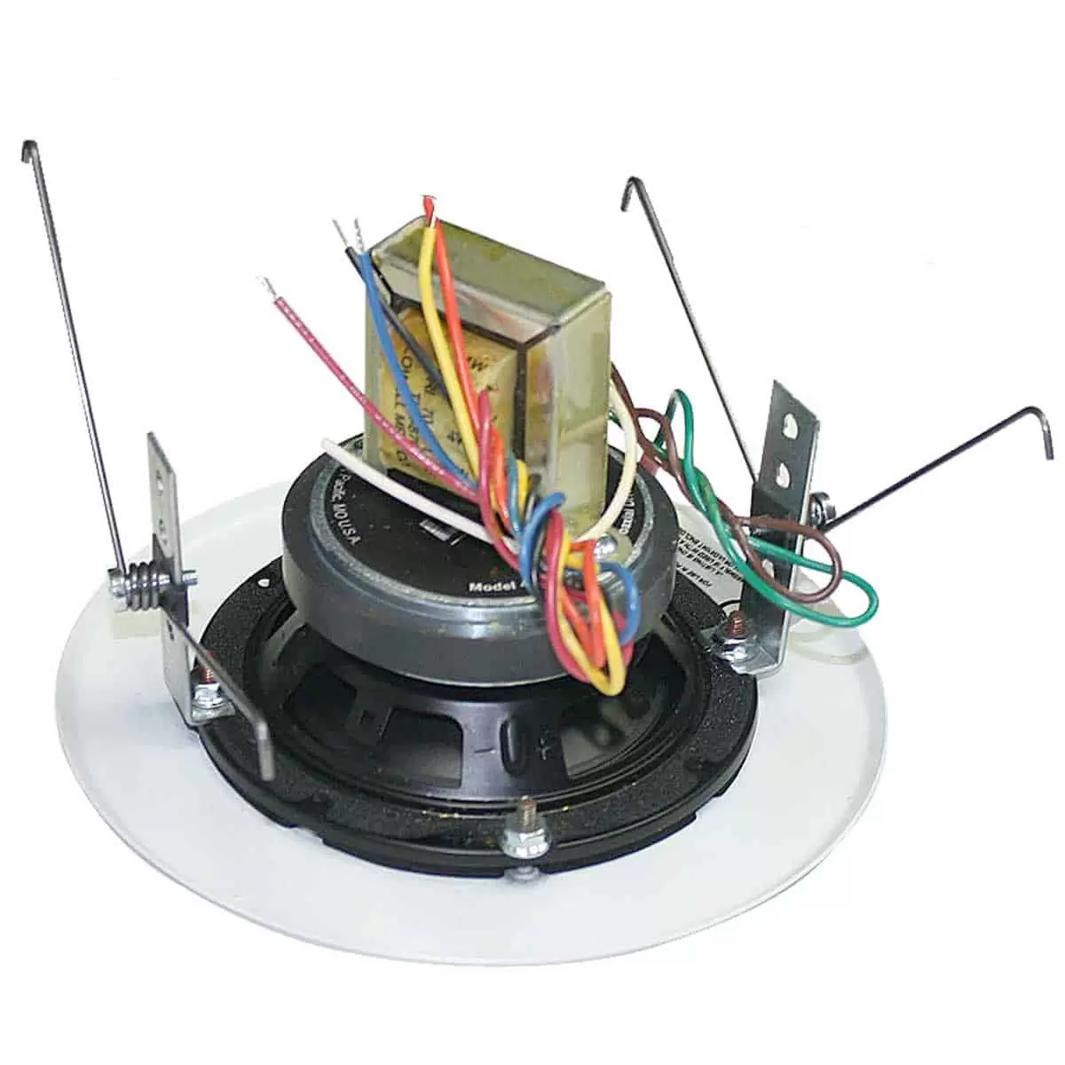 The speaker assembly shall be Lowell Model WB4T-4A30-T870, which shall include 4” driver, attached 70V 8W transformer and white torsion grille. The driver shall be of the coaxial type having high and low frequency transducers. The low frequency section shall have a 4” dia. polypropylene cone and the high frequency section shall have a tweeter with a 1″ dia. balanced-drive dome. A built-in electrical crossover network shall be employed to accomplish proper frequency division between the two drivers. The crossover frequency shall be at 5kHz with a 1st order high-pass filter. It shall be capable of producing a uniform audible frequency response over the range of 70Hz-20kHz (+6dB), 50Hz-20kHz (+8.8dB) with a dispersion angle of 135 degrees @ 2000Hz-6dB. The average sensitivity shall measure 88.0dB (SPL at 1W/1M). Rated power handling shall be 30 watts (EIA 426B). The low frequency voice coil shall have a 1” dia. and operate in a magnetic field derived from a ferrite (ceramic) magnet having nominal weight of 10 oz. The high frequency voice coil shall have a 0.53” dia. and operate in a magnetic field derived from a Neodymium magnet having a 0.06 oz. nominal weight. Voice coil impedance shall be 8 ohms. The frame shall be structurally reinforced stamped 20-ga. steel with an overall diameter of 5” with four round and four obround holes equally spaced on 4.688” dia. mounting bolt circle. All external metal parts shall be finished in black enamel paint or zinc plating to resist rust and corrosion. The transformer shall have primary taps at 8, 4, 2 and 1 watt and frequency response of 50Hz – 15kHz +1dB. It shall be factory-mounted to top of driver. The driver/transformer shall be mounted to a one-piece punched steel grille. The 7.25” dia. torsion-mount grille shall be finished in white powder coat paint.