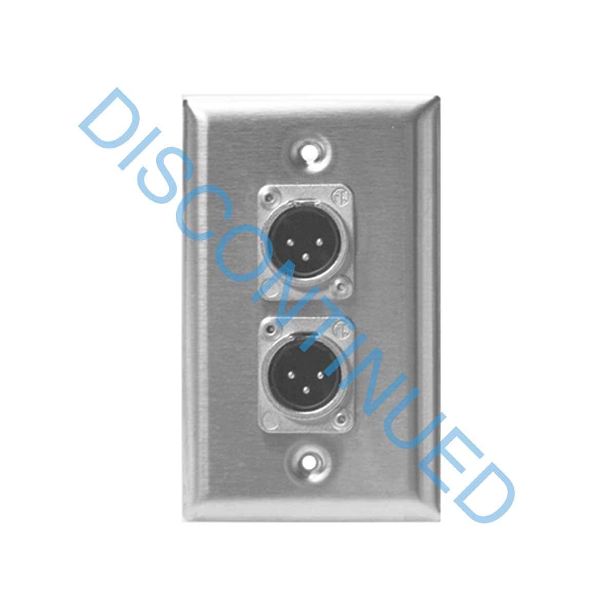 One-gang standard wall plate with factory-mounted microphone connectors provides labor-saving field installation. The stainless steel plate has countersunk mounting holes that align to standard gang-size E.O. boxes. The two factory-mounted microphone connectors are Neutrik type NC3MDL (male).