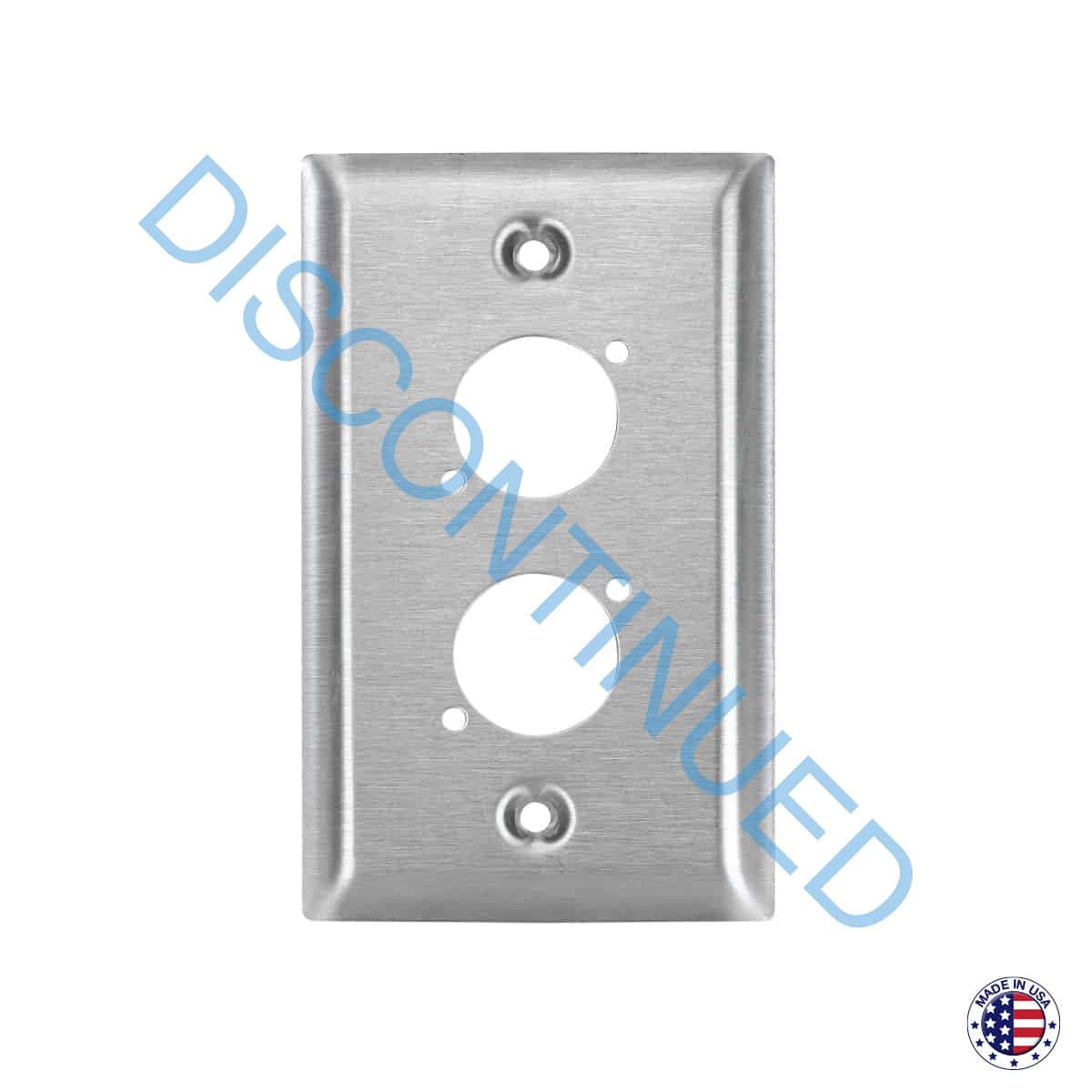 One-gang stainless steel wall plate with hole punches for two Neutrik mic connectors.