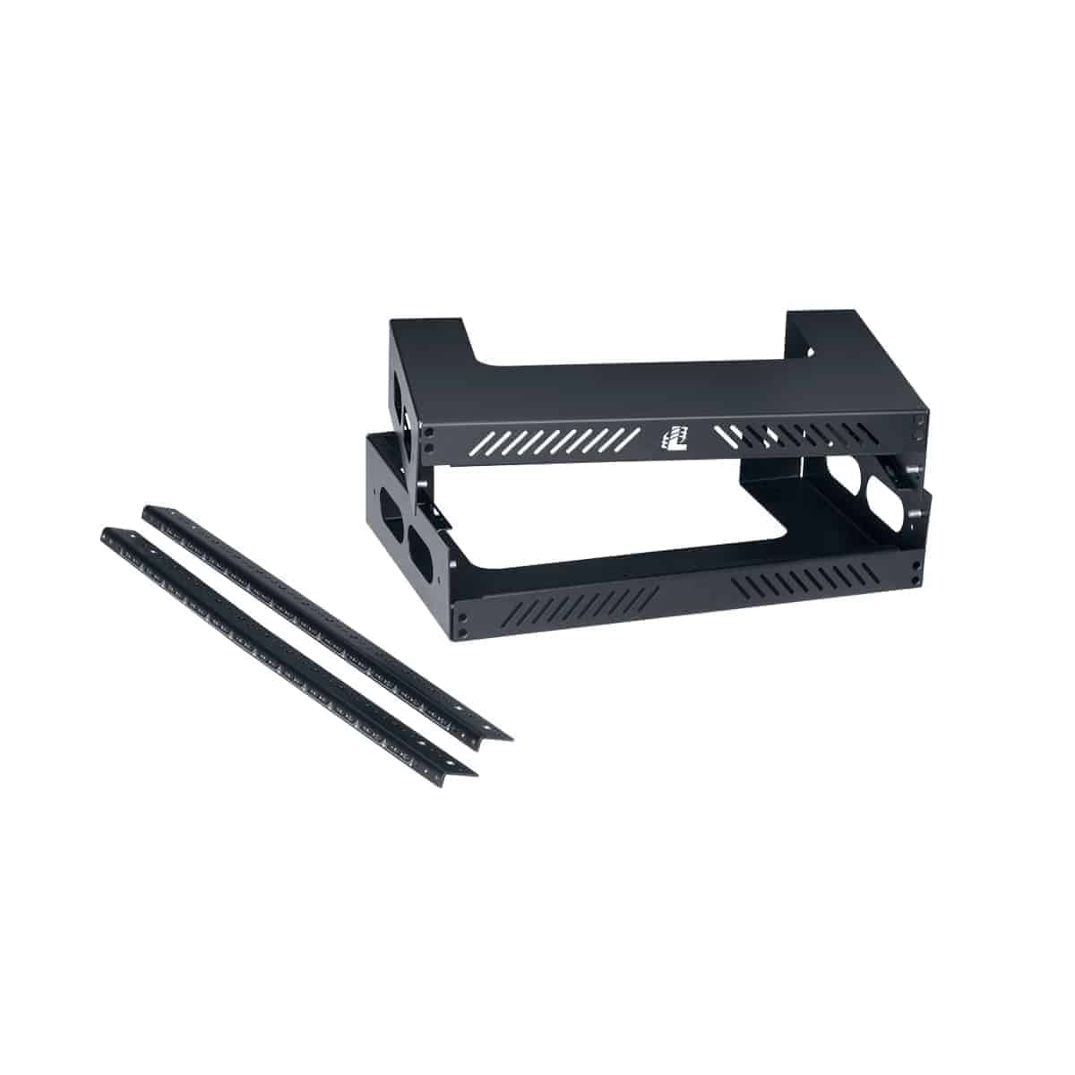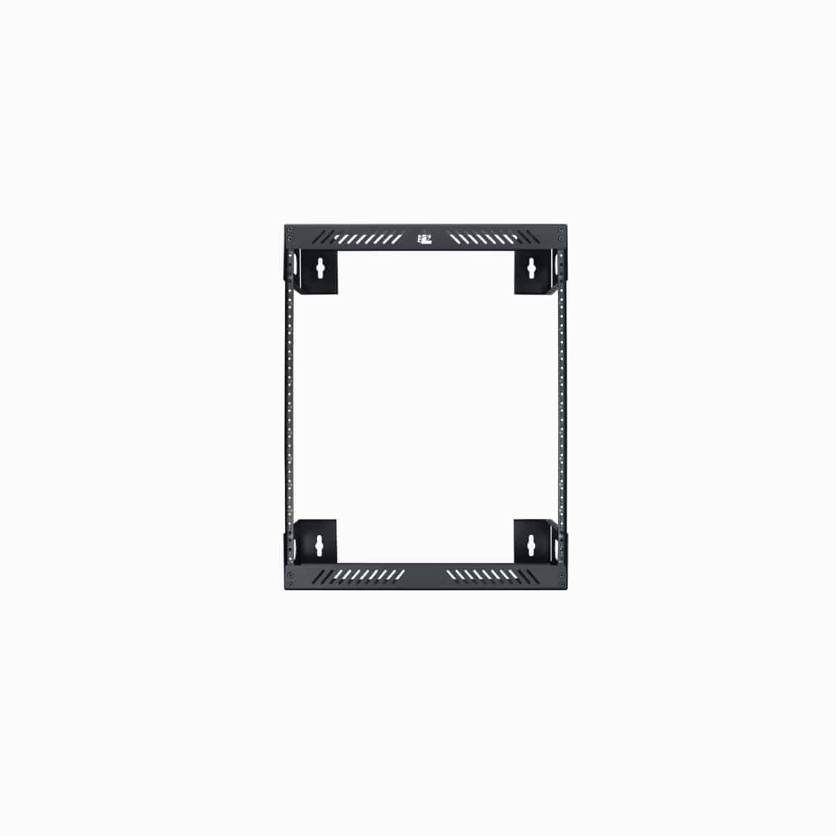 Slim open-frame wall rack mounts 19-inch equipment to wall or backboard. Top and base are heavy gauge steel that can be mounted on 16-inch centers to form a stable platform for patch panels, routers, switches, telecommunications, or computer equipment. Steel with black powder epoxy finish. Ships unassembled.