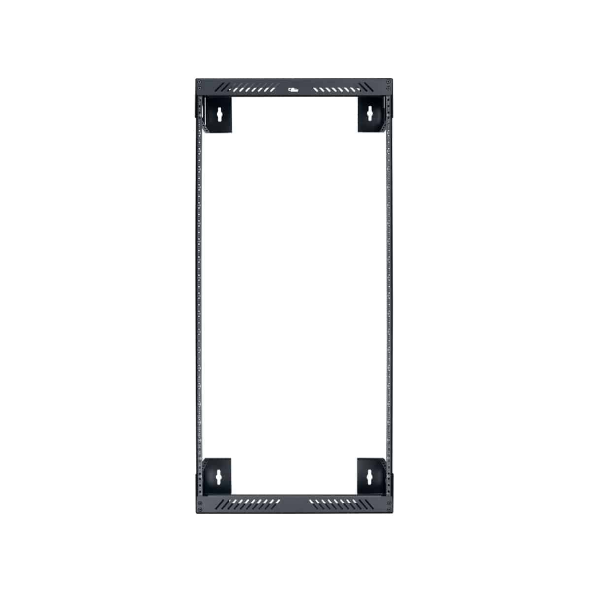 Slim open-frame wall rack mounts 19-inch equipment to a wall or backboard. Top and base are heavy gauge steel that can be mounted on 16-inch centers to form a stable platform for patch panels, routers, switches, telecommunications, or computer equipment. Steel with black powder epoxy finish. Ships unassembled.