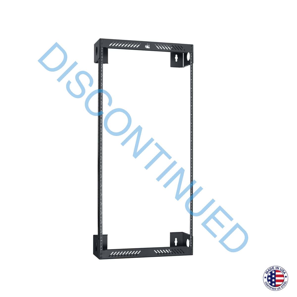>The slim open frame wall-mount rack shall be Lowell WXR-2218 with overall dimensions of 42.28″H x 6.00″D x 19.21″W. It shall provide 22 rack units of panel space. Rack construction shall be 14-gauge steel top/base with (1 pr.) 11-gauge steel corner post rails tapped 10-32 on E.I.A. spacing, with smooth black powder epoxy finish. The rack shall be manufactured in the U.S.A. with certified U.S. steel. It shall have a load capacity of 200 lbs. when properly mounted. It shall ship unassembled.